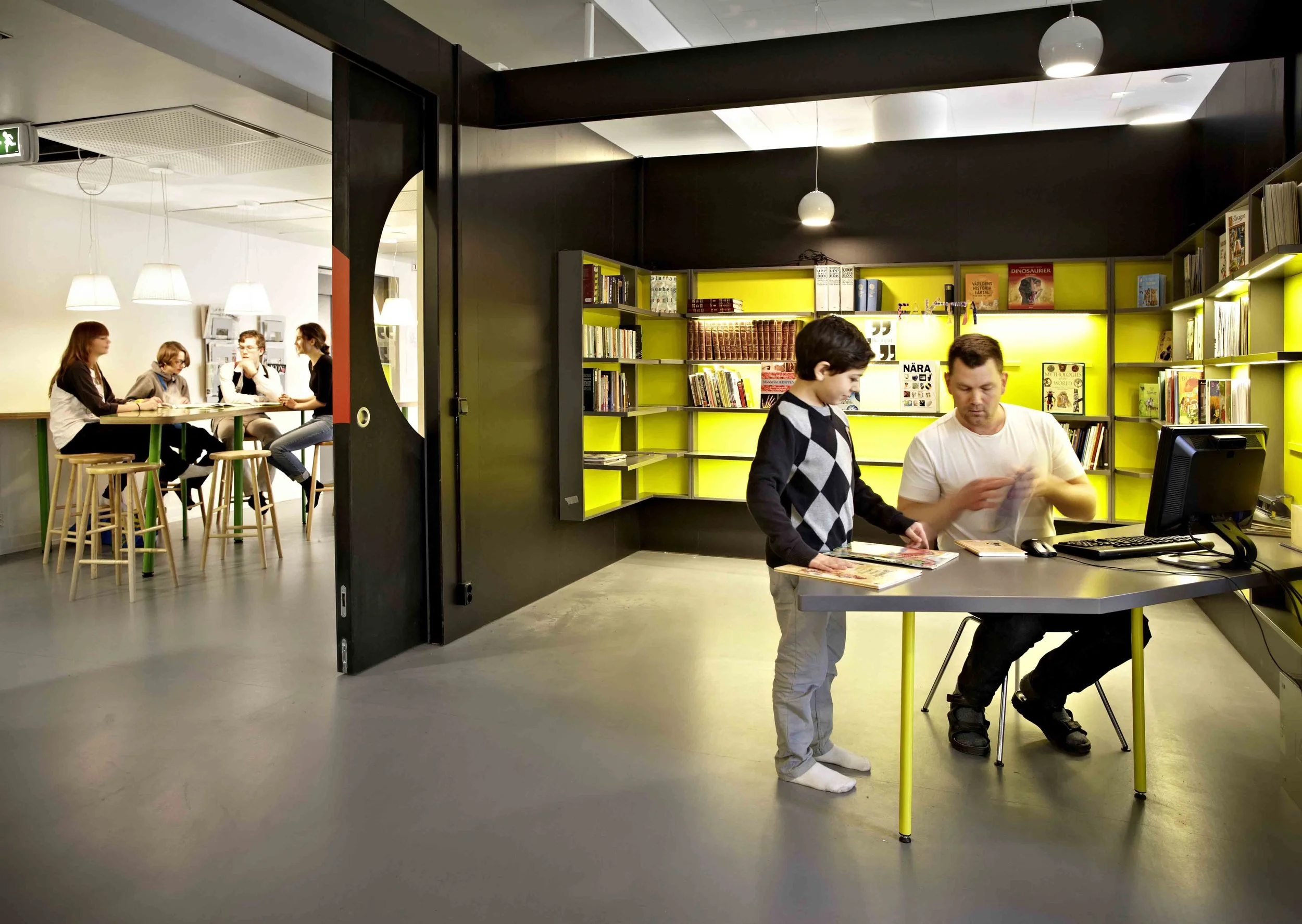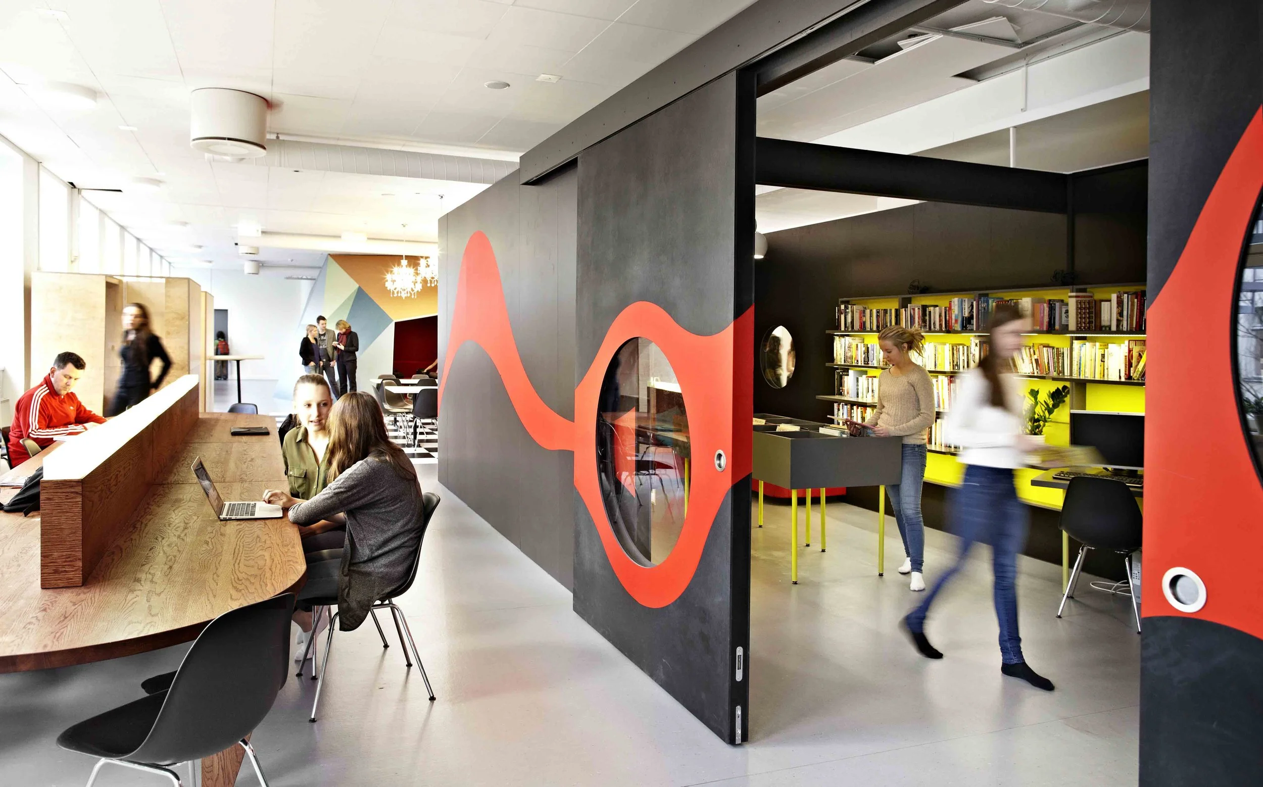 The design strives to support the school’s teaching methods and gives teachers and students the opportunity to work in different settings depending on the learning situation. Included are small alcoves for concentration and contemplation, a colourful cave with deep red upholstery, organic high tables for group work and soft lounge furniture for informal gatherings.